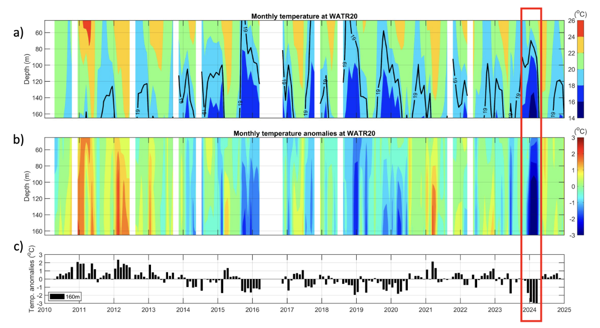 An exceptional subsurface cooling event that occurred from early January to late March 2024, at 40-160 m depths (Figure 1, red box) was recorded by the instruments at the WATR20 mooring (200 m depth; Figure 2). This event was marked by temperatures as low as 12oC in January, at 200 m, with monthly averaged temperature anomalies being about 3°C cooler than climatology (Figure 1b, c).