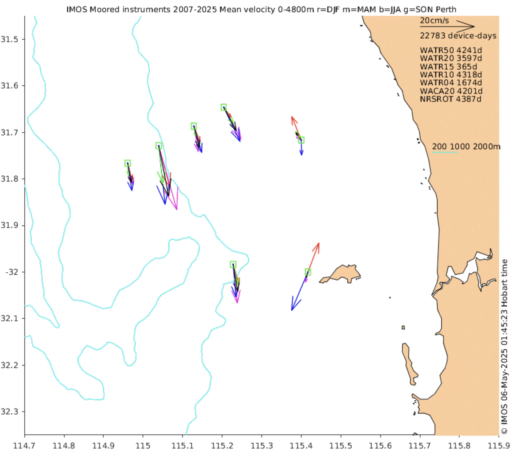 Figure 2: Location of the IMOS National Mooring array off Perth, with full-depth seasonal mean velocities (colours) over the full 2007-2025 record.