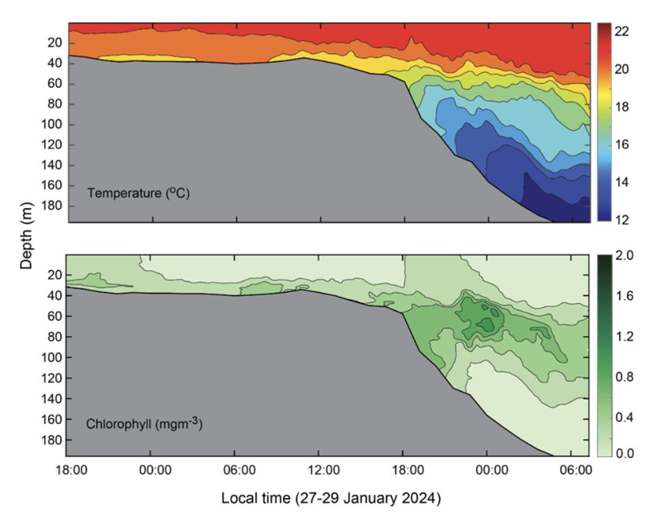 Figure 3: Temperature (top) and chlorophyll-a concentration (bottom) measured by an IMOS ocean glider off Two Rocks in 27-29 January 2024.