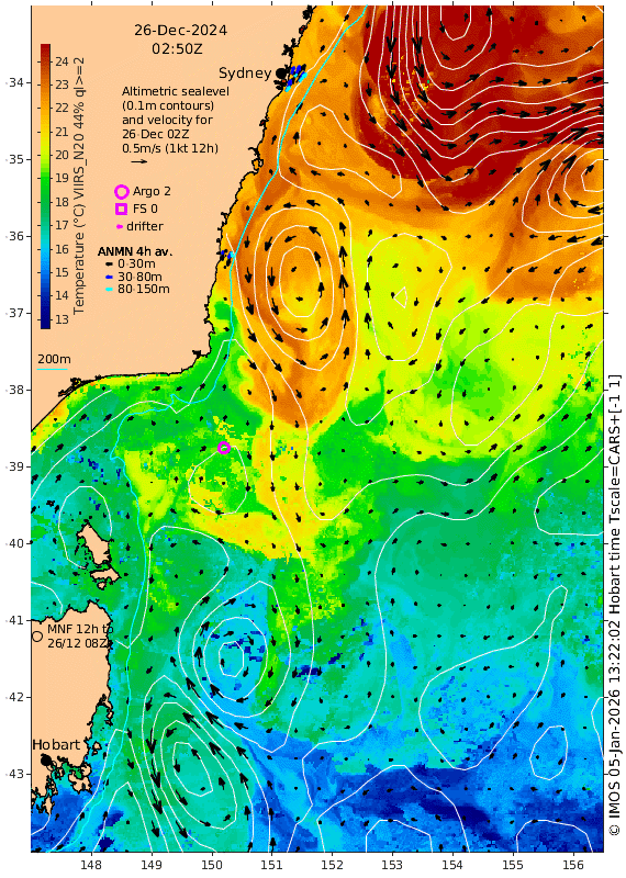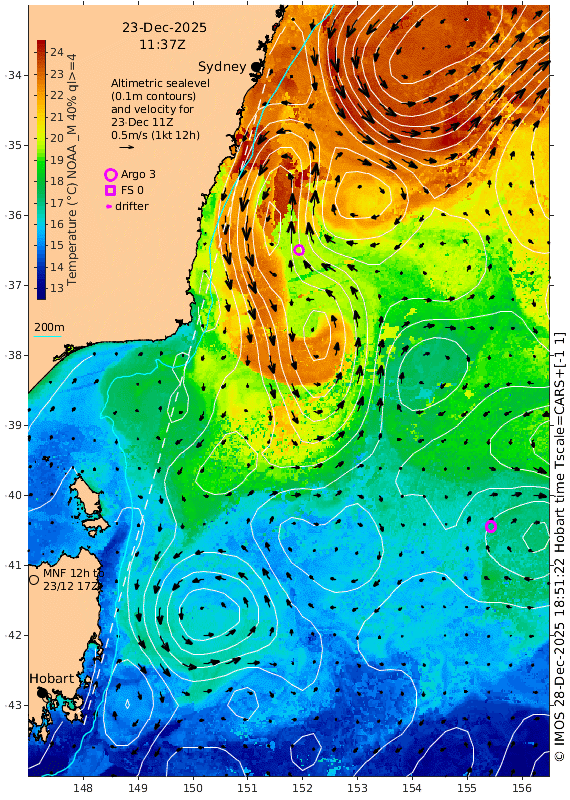 1. The main core of the East Australian Current will not affect the first stage of the race because it is presently about 150km east of Sydney. Closer to Sydney, there is possibly a weak adverse current. This was the situation last year – see the still below or re-live December 2024 by viewing this animation which shows how the eddy off Narooma was formed. The animation also includes measurements by current meters off Sydney and Narooma (that are not available in real time) to show the rapid variations of coastal currents that we cannot estimate from satellite data very well.